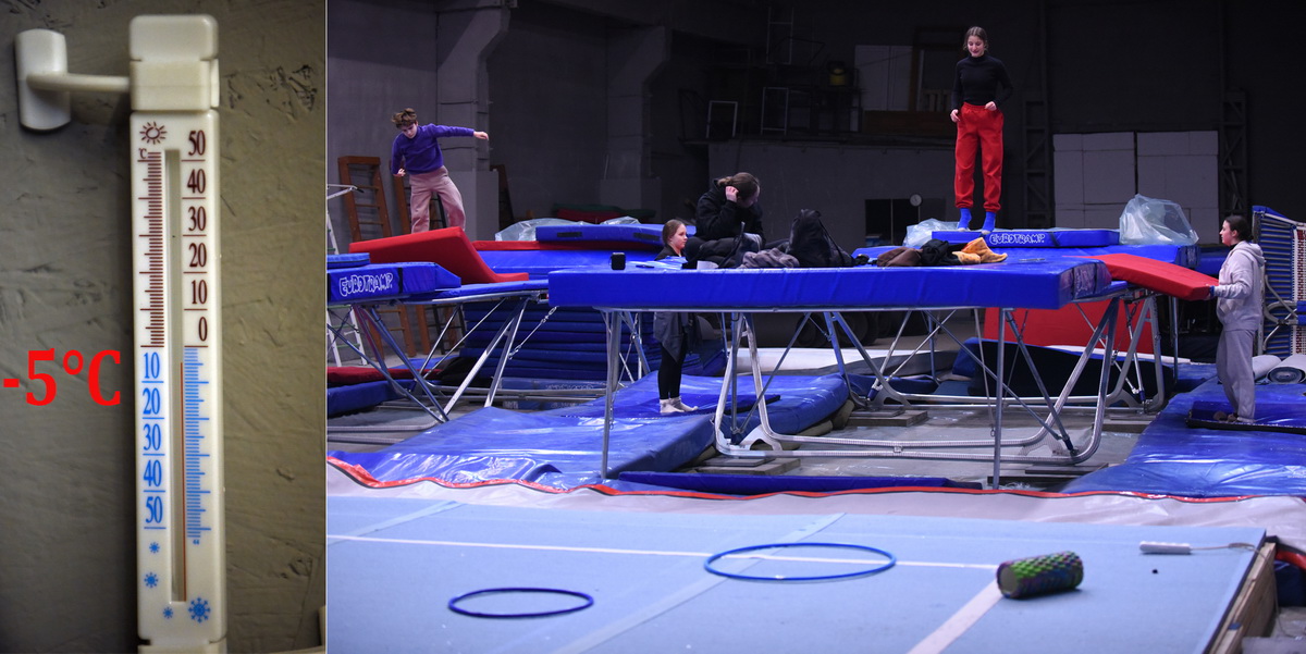 В найхолодніші дні температура падає нижче нуля – до мінус чотирьох-п’яти градусів, тому батутисти в основному тренуються в КДЮСШ №1, де займаються фізпідготовкою. У «новий зал» заходять іноді пострибати, максимум на годину, щоб як мінімум не втрачати, так би мовити, відчуття часу в повітрі, не говорячи вже про технічні навички…