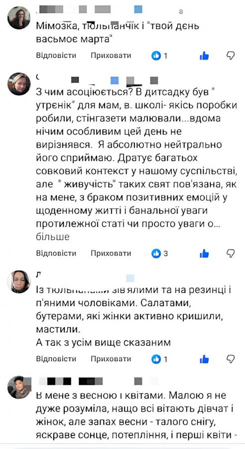 Цю «оптовість» підтверджує і журналістка Ярина Ревчук, згадуючи вимушені подарунки від однокласників, які були лише «відкаткою» за 23 лютого. Науковиця та соціологиня Людмила Малес малює впізнавану картину: тюльпани на резинці, п’яні чоловіки та жінки, які замість відпочинку активно кришать салати й мастять бутерброди. Ольга Ринк-Кордун, письменниця, досі здригається, згадуючи тисняву в набитому автобусі, де чоловіки напідпитку з жалюгідними букетами мало не зламали їй, тоді малій і худій дівчинці, ребра: «8 Березня ненавиджу. Вдома ніколи не святкували. Мімози, гвоздики як атрибут свята досі не люблю, брррррр».