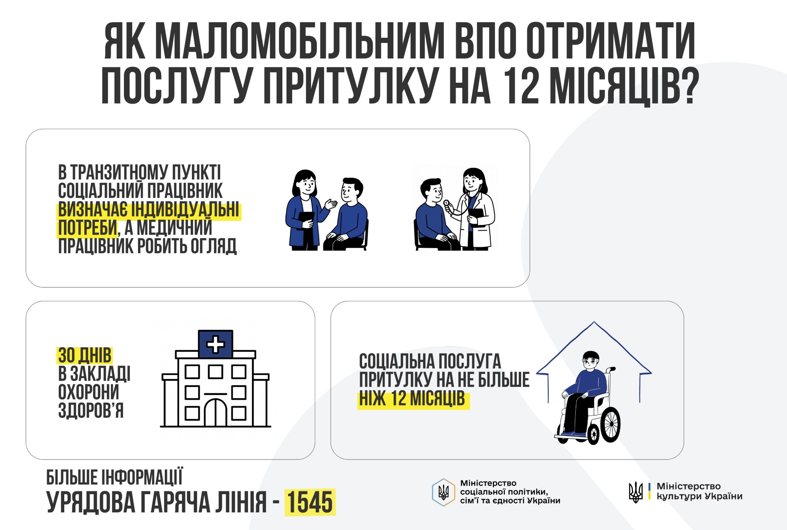 - Супровід соціального працівника (визначення потреб, допомога з житлом)
