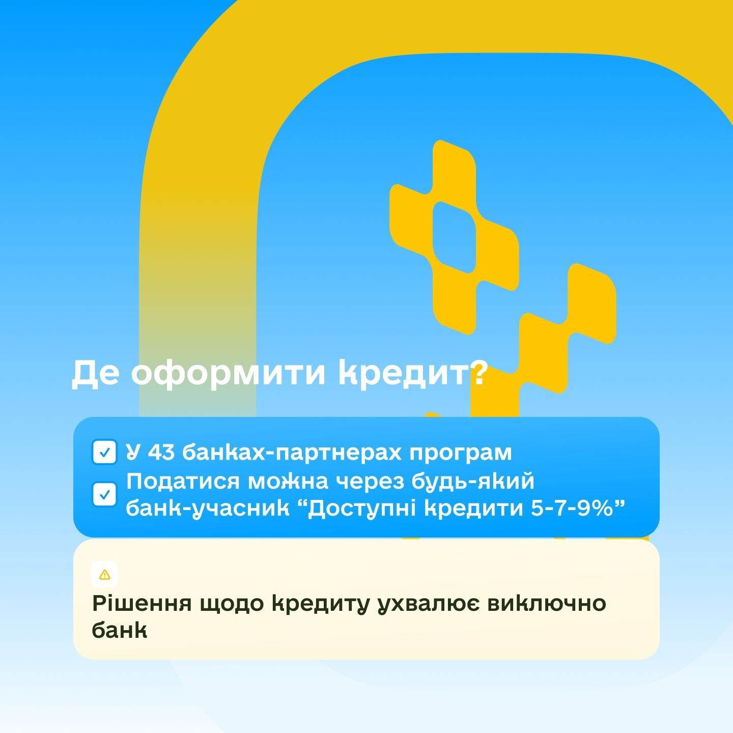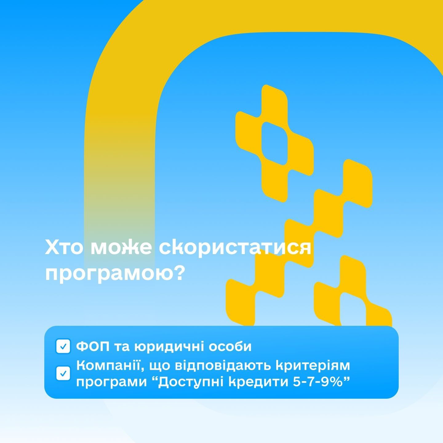 Суть програми Це пільгове кредитування під 0% річних у межах державної програми «Доступні кредити 5-7-9%», доступне як ФОП, так і юридичним особам (мікро-, малому та середньому бізнесу), які підходять під критерії програми.