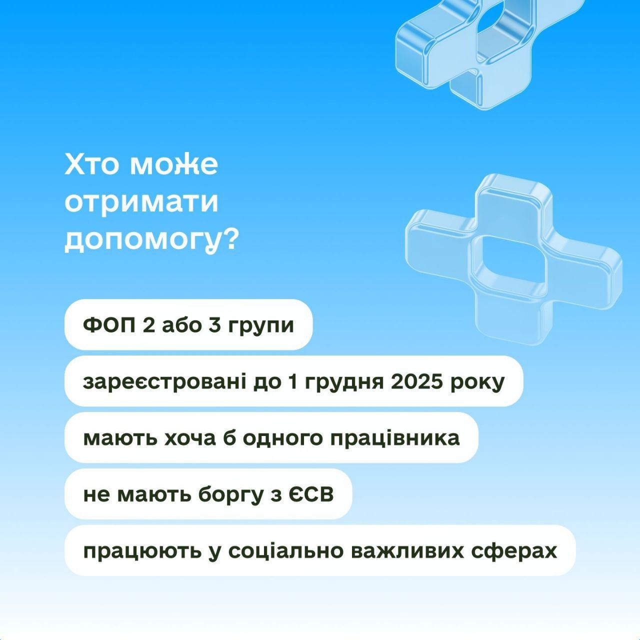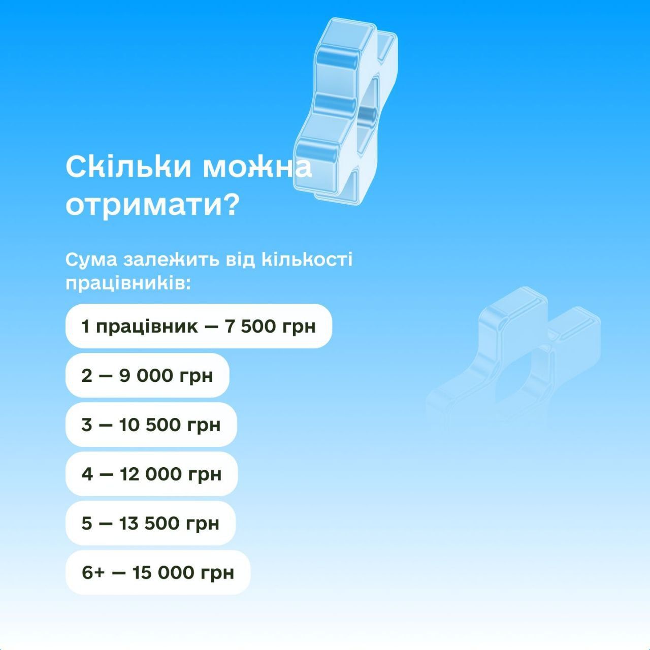 Розмір допомоги — від 7 500 до 15 000 гривень, залежно від кількості найманих працівників.