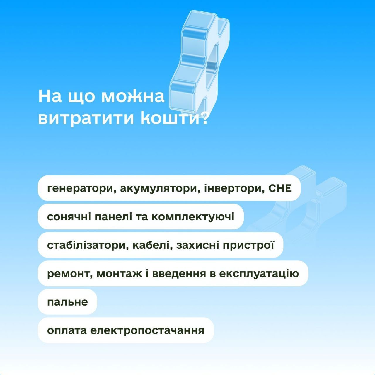 Кошти можна спрямувати на забезпечення роботи під час відключень електроенергії: придбання або ремонт генератора чи іншого енергообладнання, пальне для генератора або оплату комунальних послуг.