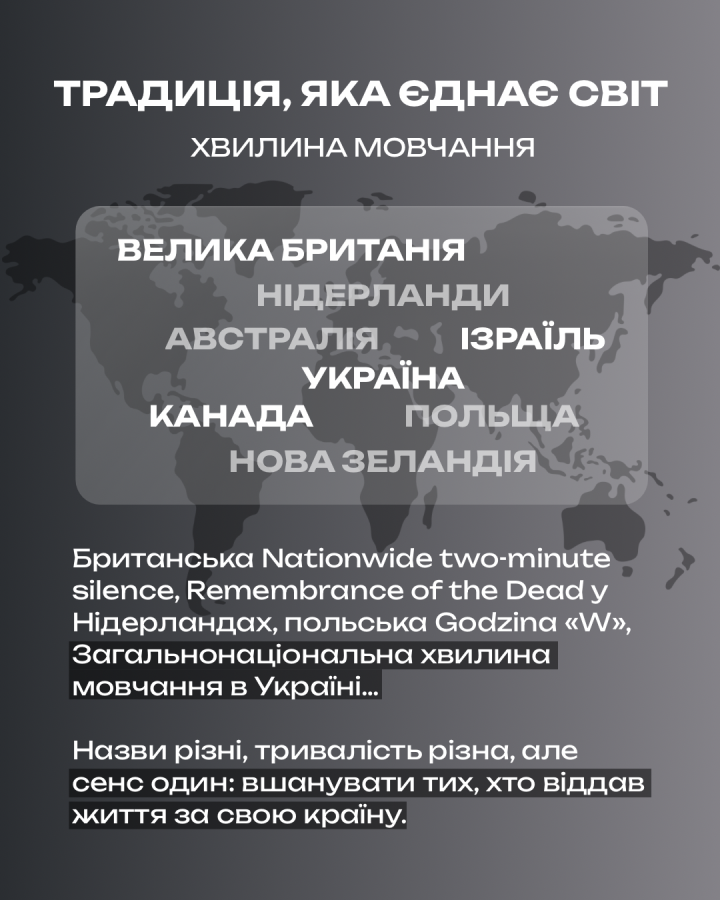 У багатьох країнах існує традиція загальнонаціональної хвилини мовчання, зокрема в Ізраїлі, Канаді, Нідерландах, Австралії, Новій Зеландії, Великій Британії, Польщі люди завмирають, щоб вшанувати своїх – тих, хто загинув. Британська Nationwide two-minute silence, нідерландське Remembrance of the Dead, польська Godzina «W» – у всіх різна тривалість, різні назви, але спільна мета: зберегти пам’ять про втрати і про тих, хто віддав життя за Батьківщину. Зазвичай ці моменти тиші прив’язані до певної дати, річниці, події. В Україні – інакше. У нас щодня о 9:00 триває загальнонаціональна хвилина мовчання на честь полеглих у війні за Незалежність. Це не формальність, а відповідь на потребу пам’ятати – щиро, щоденно, разом. Бо тиша теж може бути голосом нації.