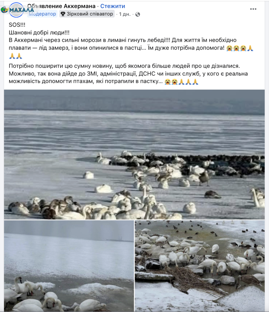 Днями в одному з білгород-дністровських пабліків у Facebook був опублікований допис, в якому зазначалося, що птахи, а саме лебеді, опинилися у крижаній пастці на місцевому лимані.