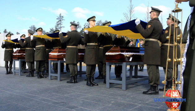 На Національному військовому меморіальному кладовищі відбулася церемонія почесного поховання неопізнаних тіл (останків) військовослужбовців та поліцейських, які загинули внаслідок збройної агресії проти України.