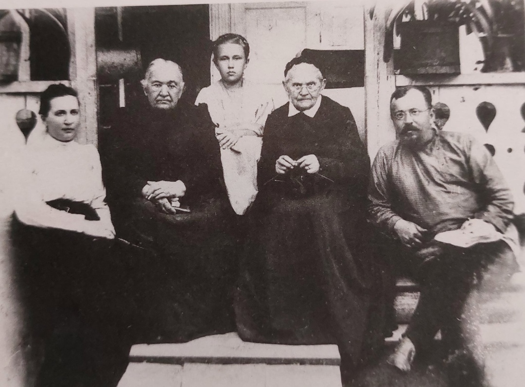 Надія з мамою Ганною Іванівною, прабабусею Катериною Григорівною Мариновською, її сестрою Євдокією Григорівною Канівецькою та батьком Віталієм Петровичем Суровцовим у садибі прабабусі. с. Гельмязів (нині Черкащина). 1902. ЦДАМЛМ України.