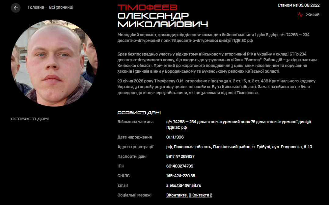 Як зазначається, підозрюваний Олександр Миколайович Тімофєєв (1996 року народження) – громадянин Російської Федерації, уродженець Псковської області. Під час повномасштабного вторгнення служив молодшим сержантом у 234-му десантно-штурмовому полку 76-ї десантно-штурмової дивізії Повітряно-десантних військ РФ (військова частина 74268, дислокується у Пскові).