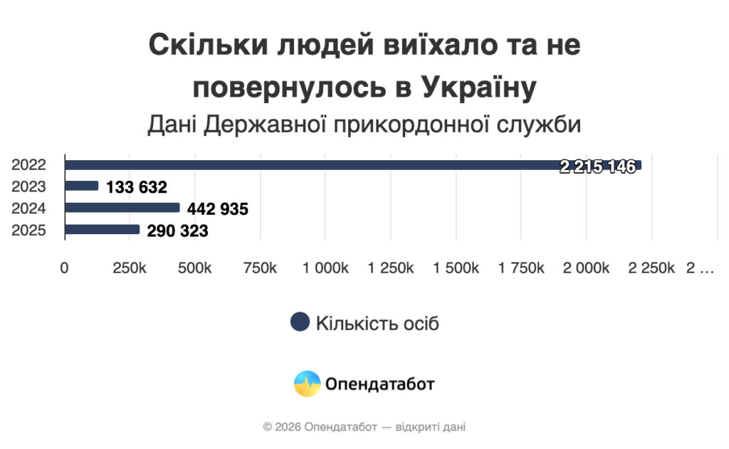 Загалом 3,1 мільйона громадян офіційно виїхало з підконтрольної території України та не повернулось за чотири роки повномасштабної війни. 72% з них зробили це в перший рік повномасштабного вторгнення.