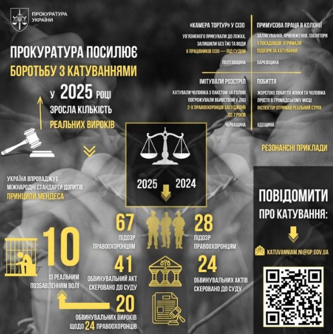 «У 2025 році органами прокуратури повідомлено про підозру 67 правоохоронцям у вчиненні кримінальних правопорушень за фактами катування чи нелюдського або такого, що принижує гідність людини, поводження», — йдеться у звіті.
