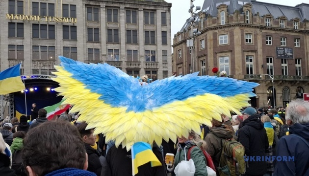 Українські військові пройшли ходою від Музейної площі до площі Дам у самому центрі Амстердама, де відбувся мітинг за участі посла України Андрія Костіна, глави МЗС Нідерландів Девіда ван Віла, міністра оборони Рубена Брекельманса, політиків і волонтерів.