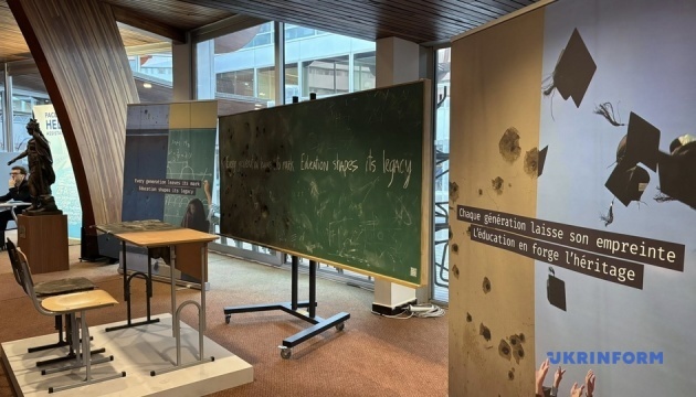 У Раді Європи в Страсбурзі виставили інсталяцію у вигляді звичайної шкільної парти з української школи, одна половина якої неушкоджена та символізує мир, а інша — понівечена війною.